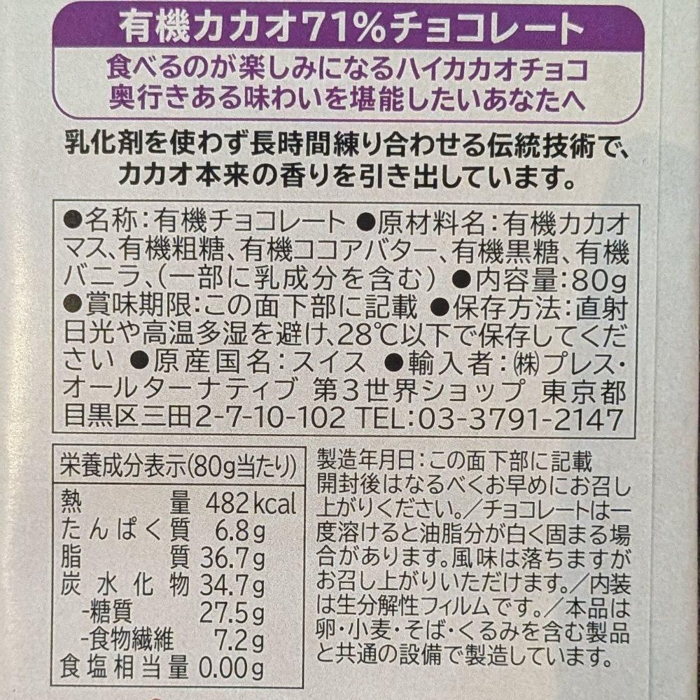 第3世界ショップ / フェアトレード 有機カカオ71% チョコレート 80g