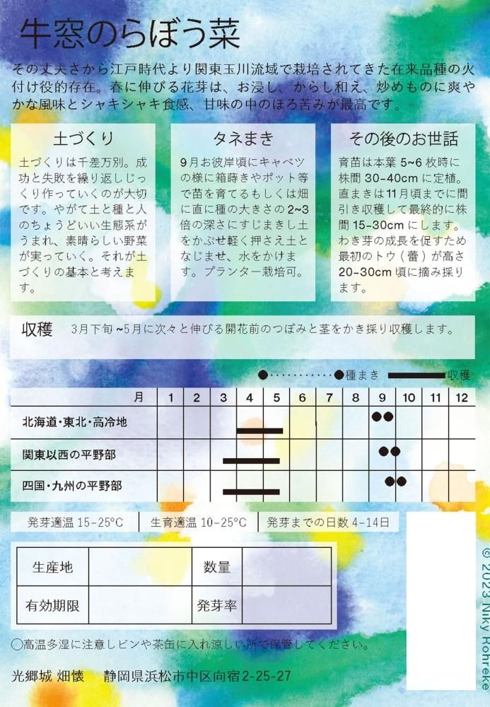 春にのびる若いつぼみと茎を食します。おひたし、汁の具、天ぷら、油炒めなどその味は抜群です。9月まき収穫は3~5月。その丈夫さから野良生えが「のらぼう」になったとか元々はオランダ船が持ち込んだ西洋アブラナ草の一種といわれ江戸時代後期に江戸近郊の天領に種子を配った記録があるそうです。風の谷ファームの採種をつづける自然栽培採種