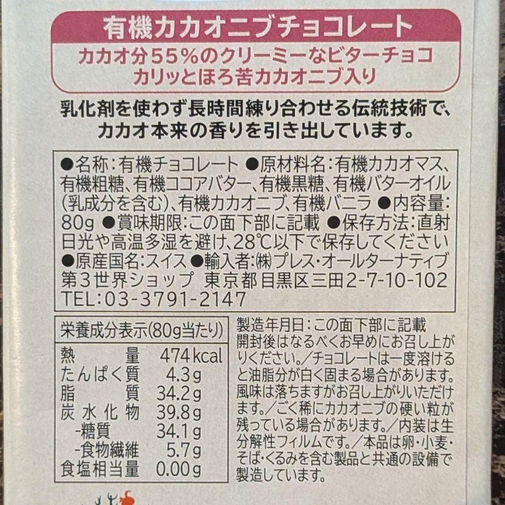 第3世界ショップ / フェアトレード 有機カカオニブチョコレート80g