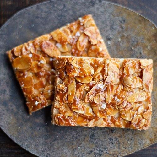 米粉のサクホロ生地に、たっぷりのアーモンドとキャラメルソースをトッピングした満足感100%の大判フロランタン。仕上げにパラっと散らした山塩小僧がアクセント!