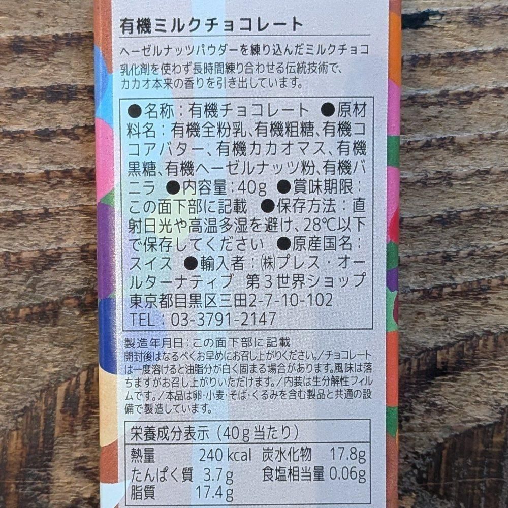 | 原材料名 | 有機全粉乳、有機粗糖、有機ココアバター、有機カカオマス、有機黒糖、有機ゲーゼルナッツ粉、有機バニラ |