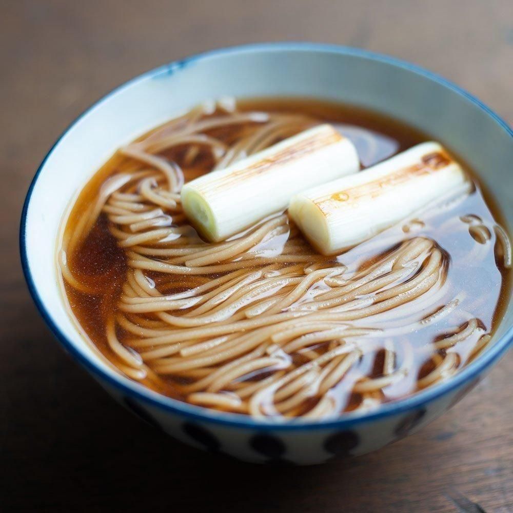 3.温めたそばつゆで麺を温めて、葱や水菜などを添えて、温かいかけそばでお召し上がりください。